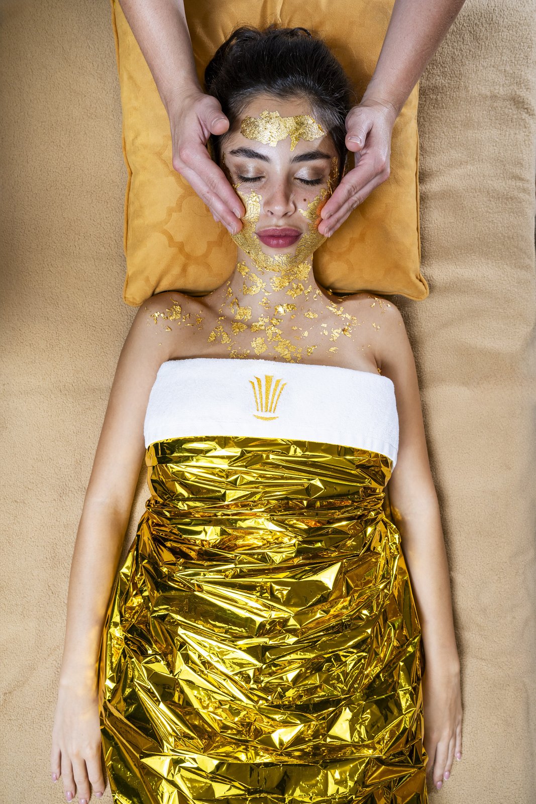 Počas hrejivého zábalu na tvár aplikujeme luxusnú, pleťovú masku z čistého 24-karátového zlata, ktorá je výnimočná nielen na Slovensku, ale aj vo svete. Pôsobí hlbšie a intenzívnejšie ako akákoľvek iná procedúra, hydratuje až niekoľkonásobne viac než kyselina hyalurónová a je elastickejšia ako kolagén. Zlatá pleťová maska je jedinou procedúrou na svete, pri ktorej sa čisté zlato absorbuje do hlbších vrstiev pleti, preto dokonale vyhladzuje vrásky, zreteľne omladzuje a spevňuje pleť. Jej účinky budete pozorovať ešte ďalšie tri týždne.
